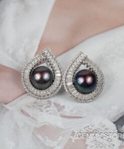 Big black bud pearl earrings with prominent silver border SE1025-Den