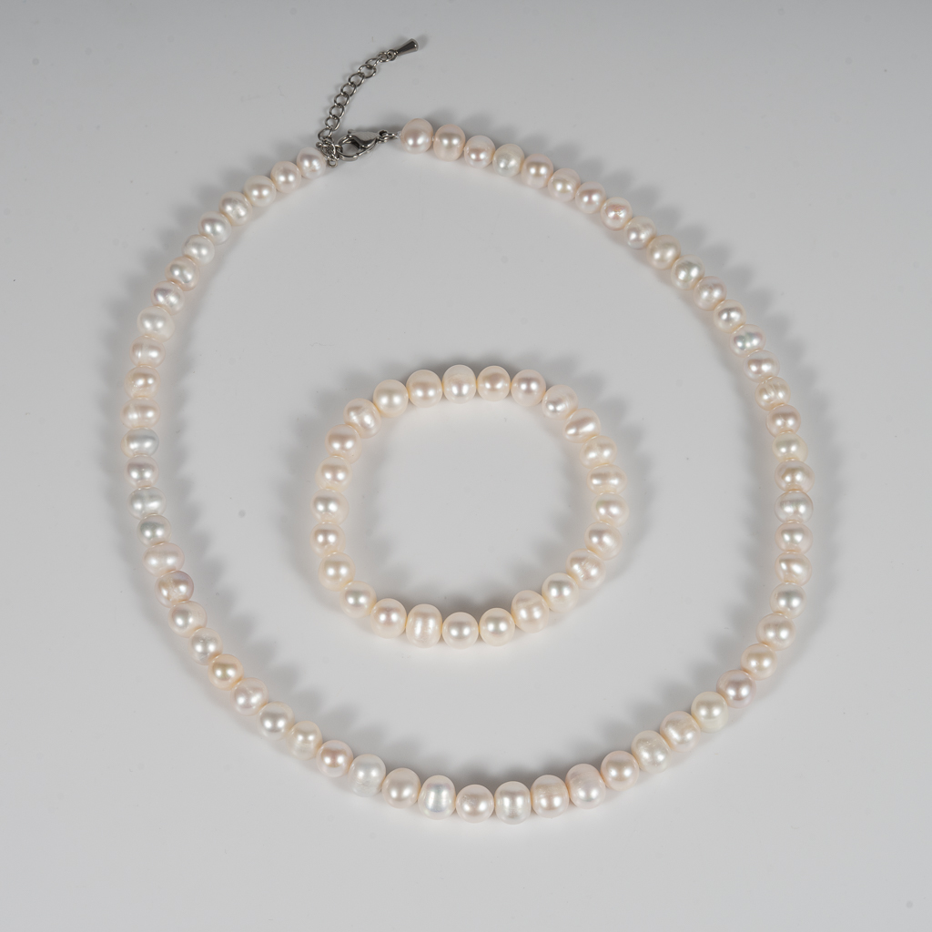Pearl Type: Freshwater Cultured Pearl Color: White Shape: Round/Necklace, Bracelet Size: 7-8mm Length: 43+5cm/necklace and 18cm/bracelet