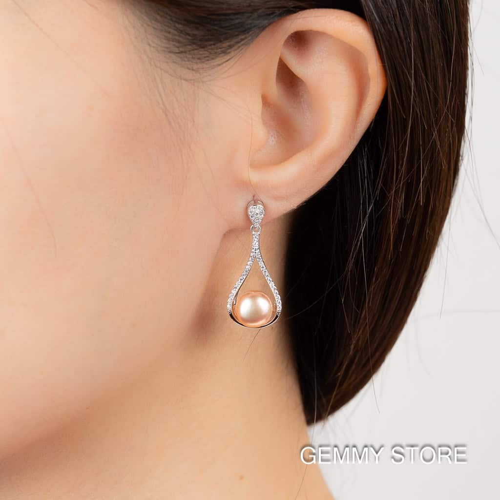 Bông tai ngọc trai hồng viền bạc dáng thả DE1005-Hong
