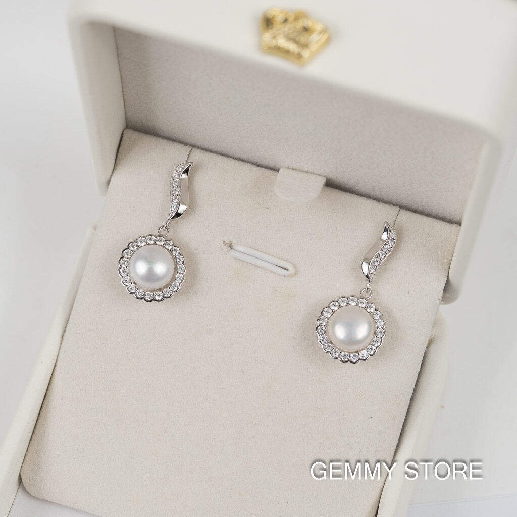 Bông tai ngọc trai trắng viền bạc dáng thả DE1006-Trang