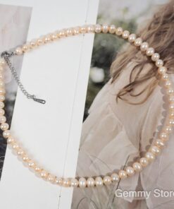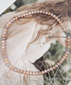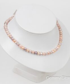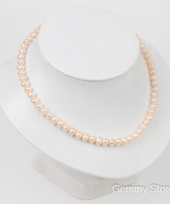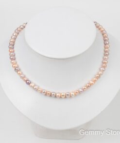 Loại ngọc: ngọc trai nuôi nước ngọt Màu sắc: hồng, pha màu Hình dạng: hơi ovan Kích thước: 6-7mm Độ dài: 40+5cm