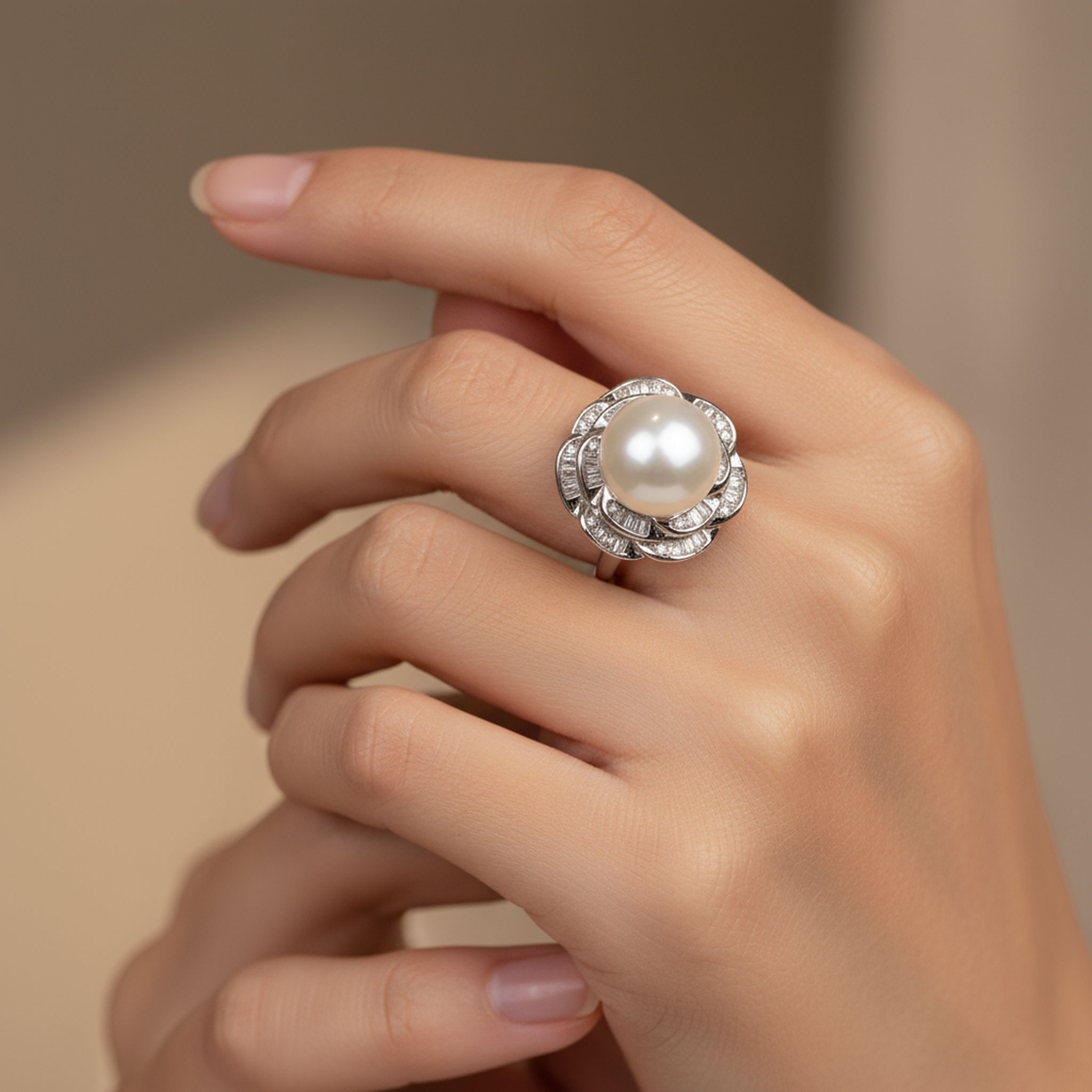 Nhẫn ngọc trai tròn viền cánh hoa hồng lỗng lẫy T24217