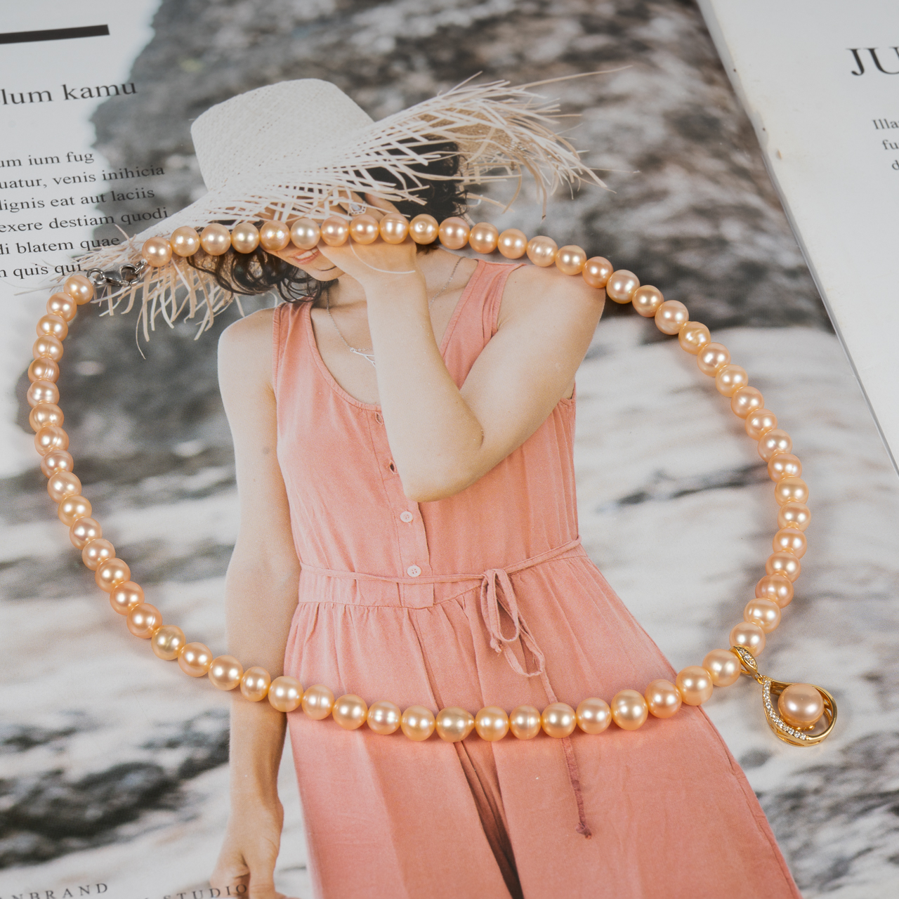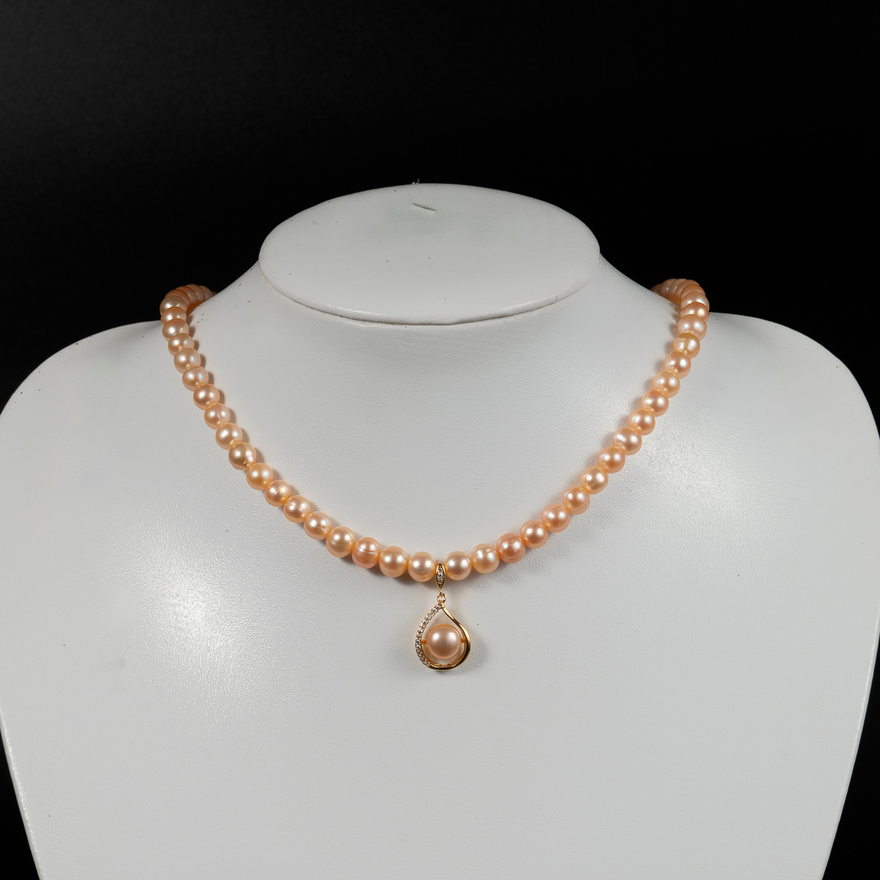 Loại ngọc: ngọc trai nuôi nước ngọt Màu sắc: Hồng Hình dạng: cầu Kích thước: 6-6.5mm Độ dài: 42cm Mặt và khóa bạc S925 xi vàng
