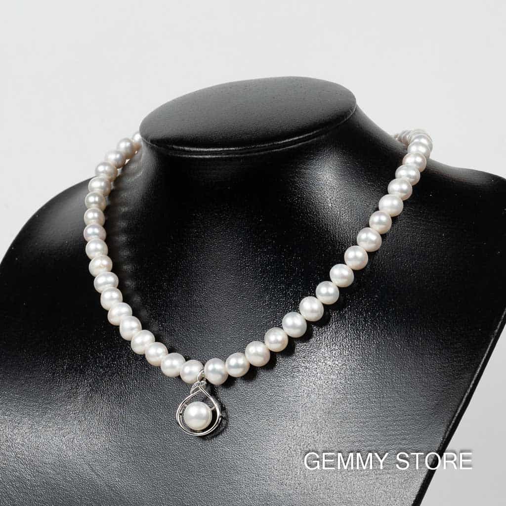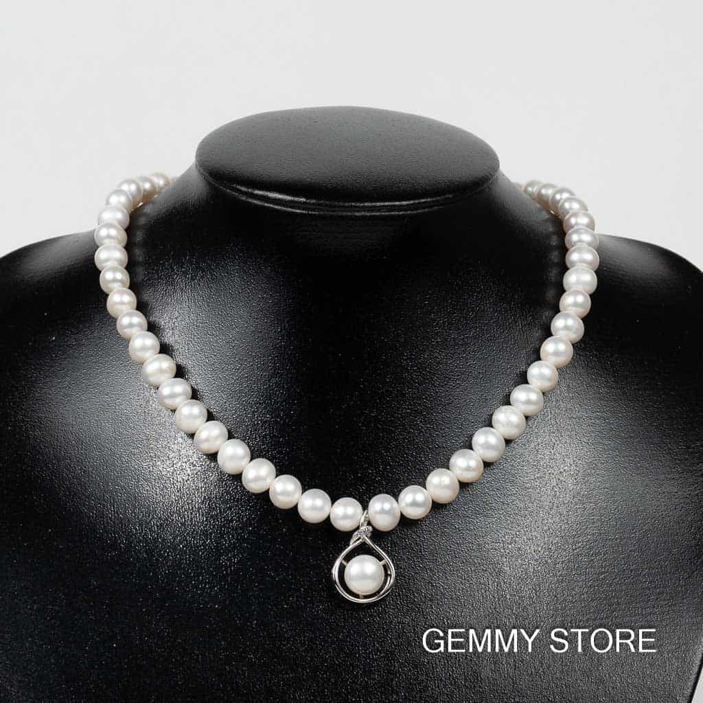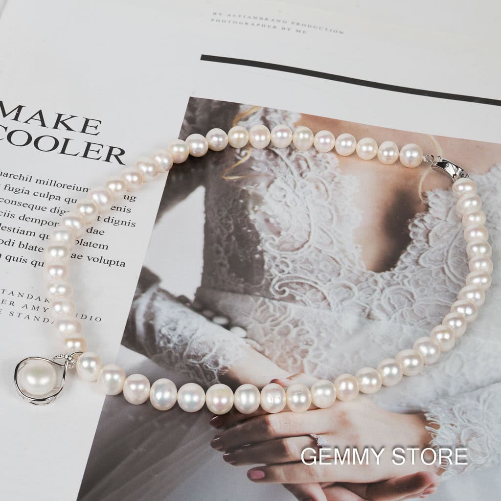 Loại ngọc: ngọc trai nuôi nước ngọt Màu sắc: trắng Hình dạng: hạt trên dây dạng trứng, mặt ngọc trai hình cúc Kích thước: 8-9 mm /vòng, 10 mm/mặt dây Độ dài: 42cm