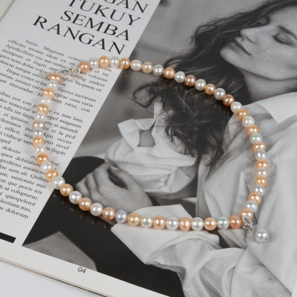 Loại ngọc: ngọc trai nuôi nước ngọt Màu sắc: Pha mầu – trắng hồng Hình dạng: cầu Kích thước: 6-6.5mm Độ dài: 41cm+3cm Mặt và khóa bạc S925 xi vàng