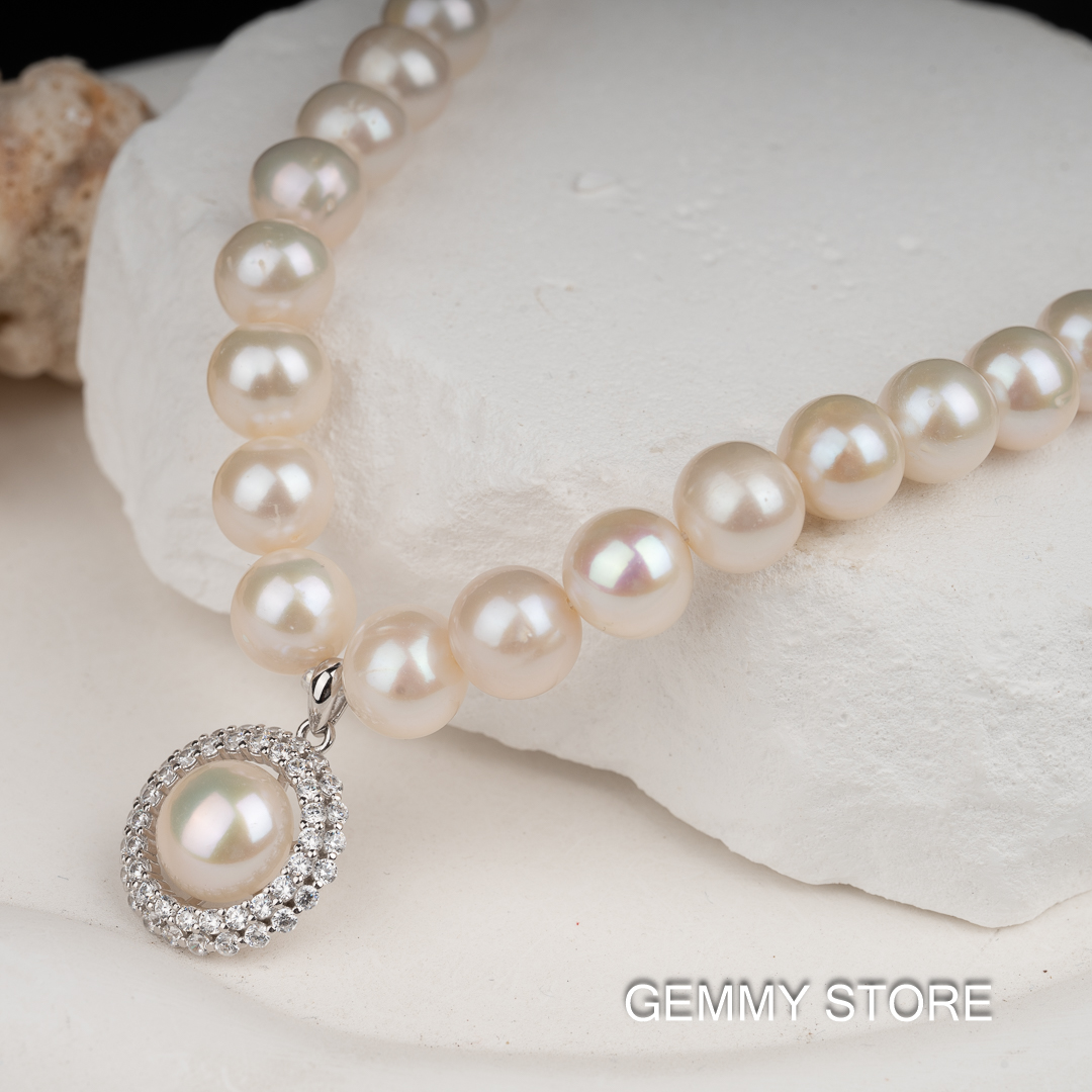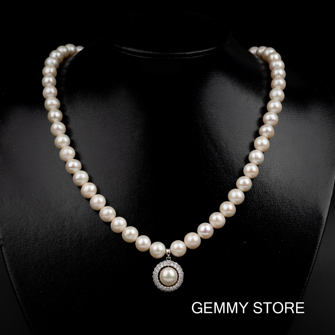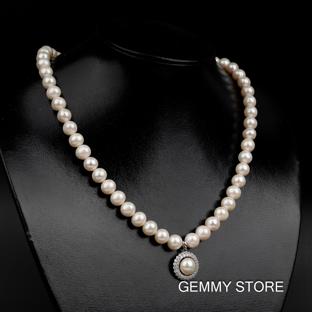 Loại ngọc: ngọc trai nuôi nước ngọt Màu sắc: trắng Hình dạng: cầu Kích thước: 8.5-9mm/ hạt, 10-10.5mm/mặt độ dài: 48cm Mặt: Bạc S925