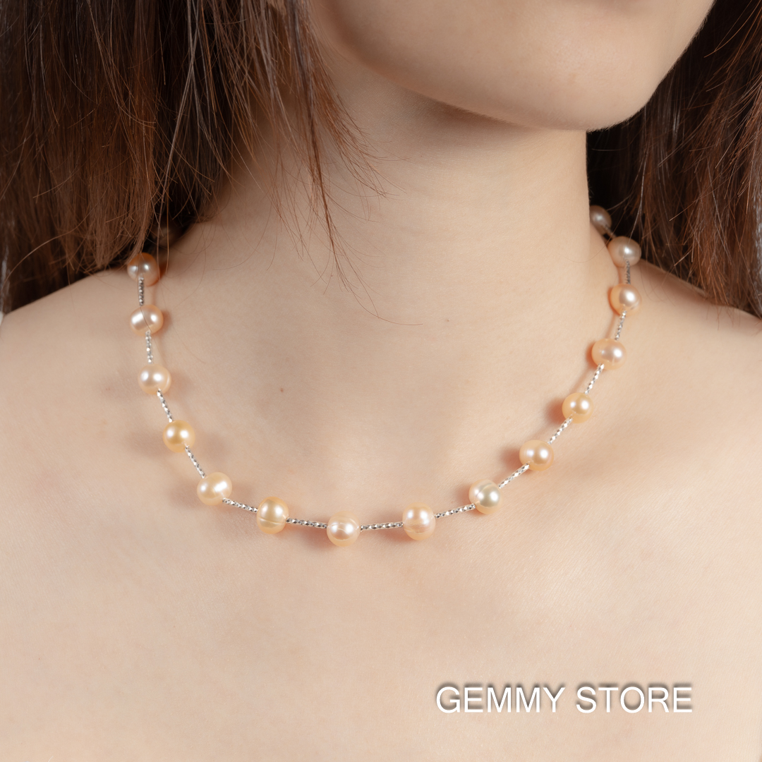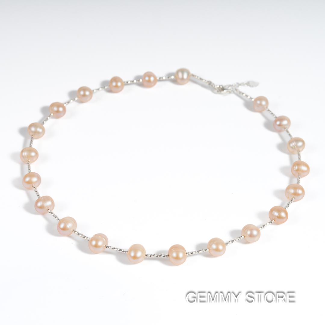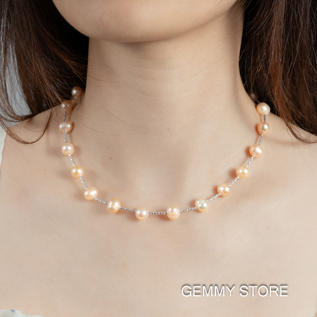Vòng Ngọc Trai Hồng Cách Hạt Kết Hợp Bạc S925 8.5 Ly NE1043
