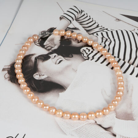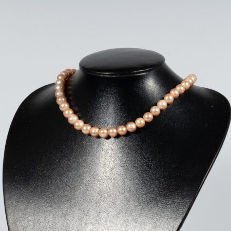 Loại ngọc: ngọc trai nuôi nước ngọt Màu sắc: Hồng Hình dạng: Cầu Kích thước: 8.5-9mm/ hạt Độ dài: 41cm