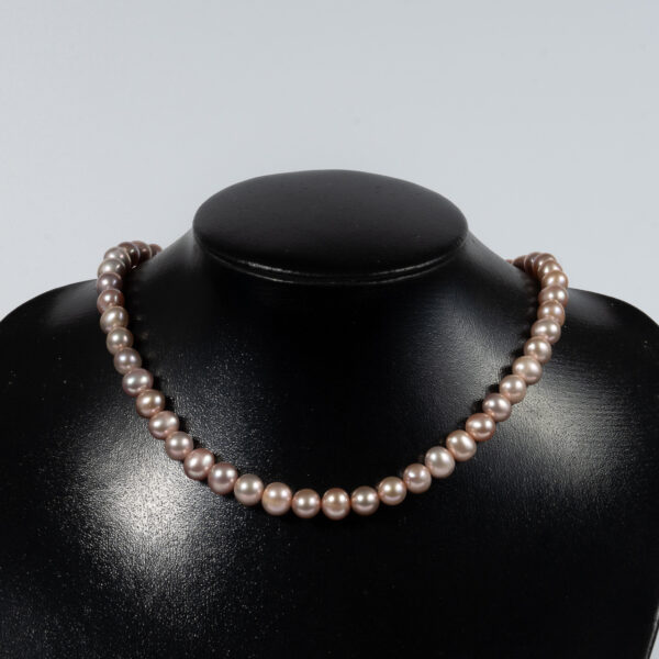 Loại ngọc: ngọc trai nuôi nước ngọt Màu sắc: tím Hình dạng: cầu Kích thước: 8-9.5mm/ hạt Độ dài: 41cm